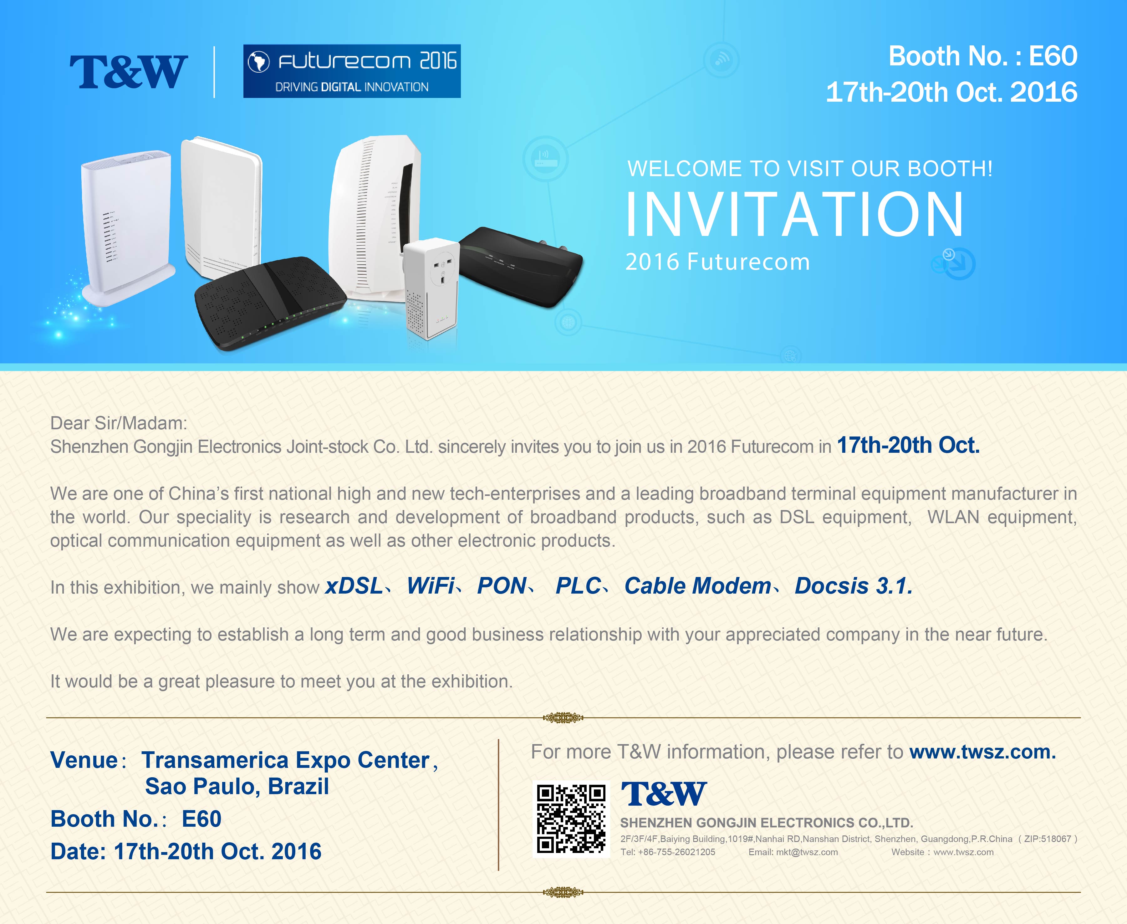 1.Exhibition Information: Name:2016 Futurecom Date:17th-20th Oct. 2016 Country: Sao Paulo, Brazil Venue: Transamerica Expo Center Booth No.:E60 2.Invitation Letter 3.Floor Plan: