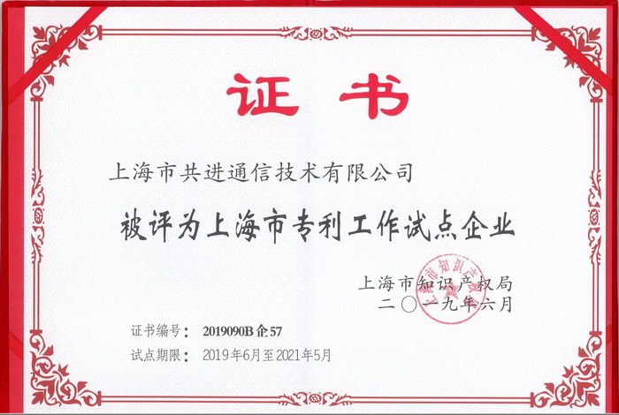 In June 2019, approved by Shanghai Intellectual Property Administration, Shanghai Gongjin Communication was awarded “Pilot Enterprise of Patent Work in Shanghai” and granted with certificate of honor.