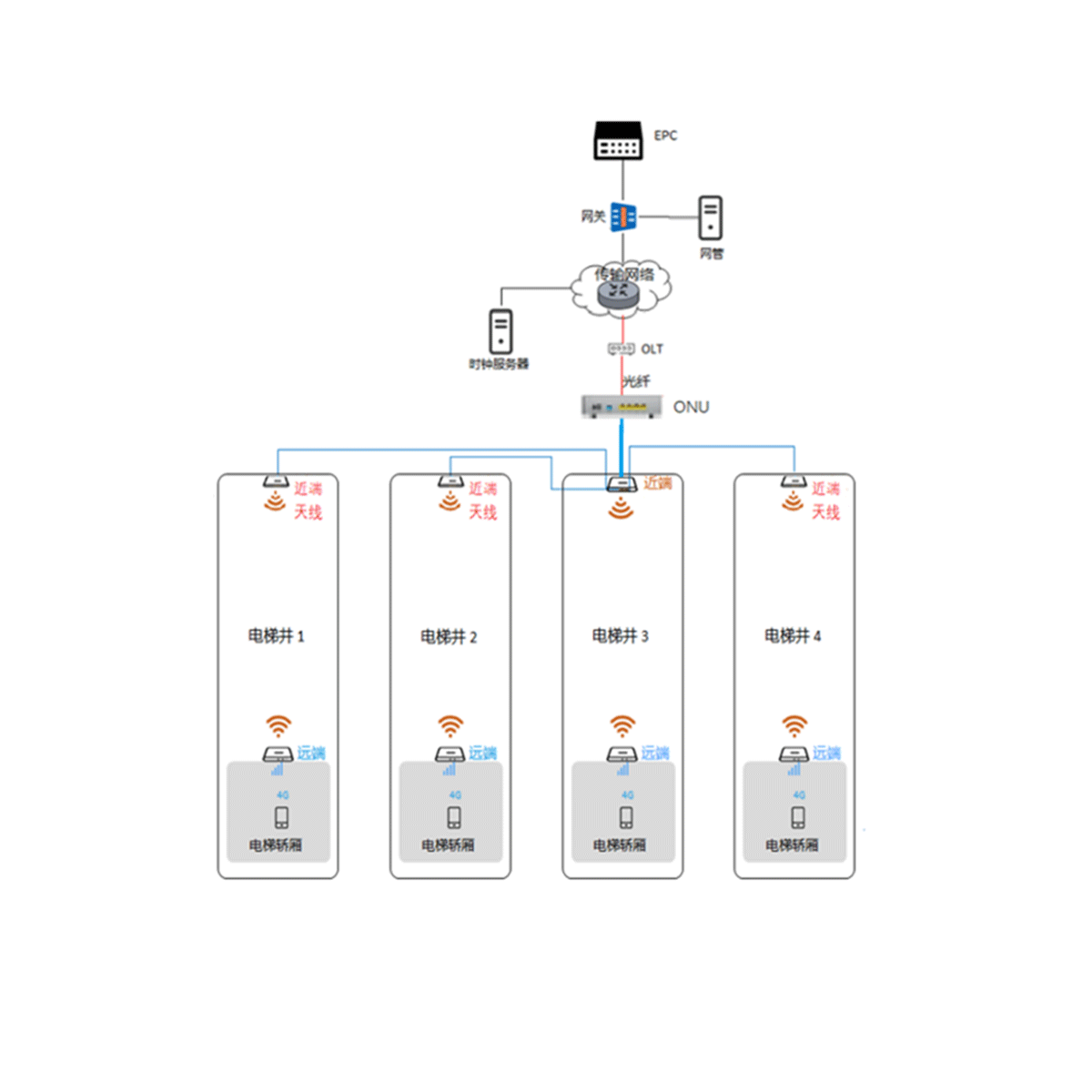 By installing a pair of 5GHz WiFi antennas at the top of the elevator shaft to cover the elevator shaft. It can support Ethernet expansion to achieve a one-to-three networking configuration, covering three elevators. The near end integrates a 5GHz WiFi bridge and router with ONU (optional) function.