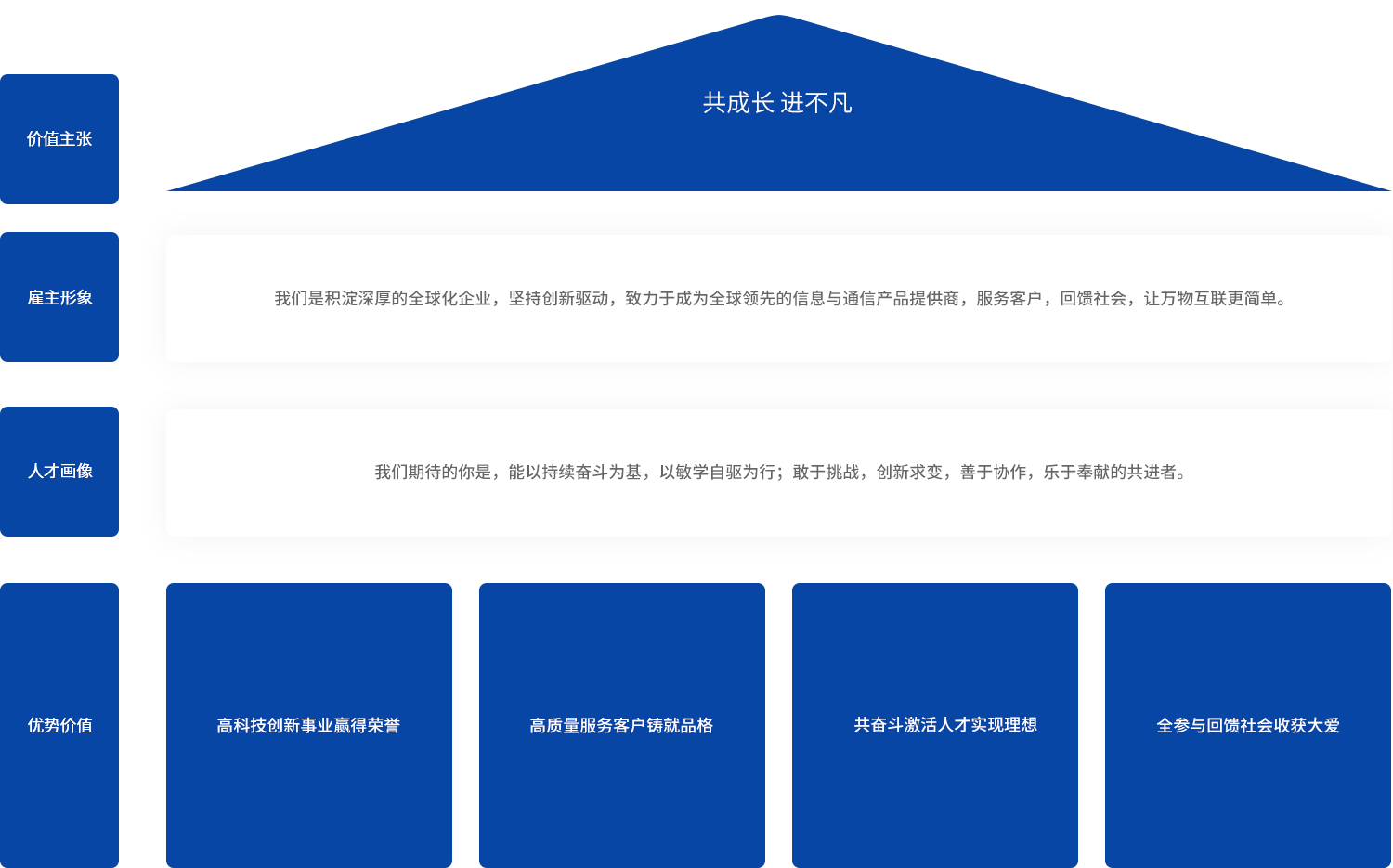 在信息与通信领域的不断创新与突破形成国际领先的核心技术、产品开发和交付能力,积累品牌优势,丰富产品种类,从而不断发展壮大,成为全球领先的信息与通信产品提供商。